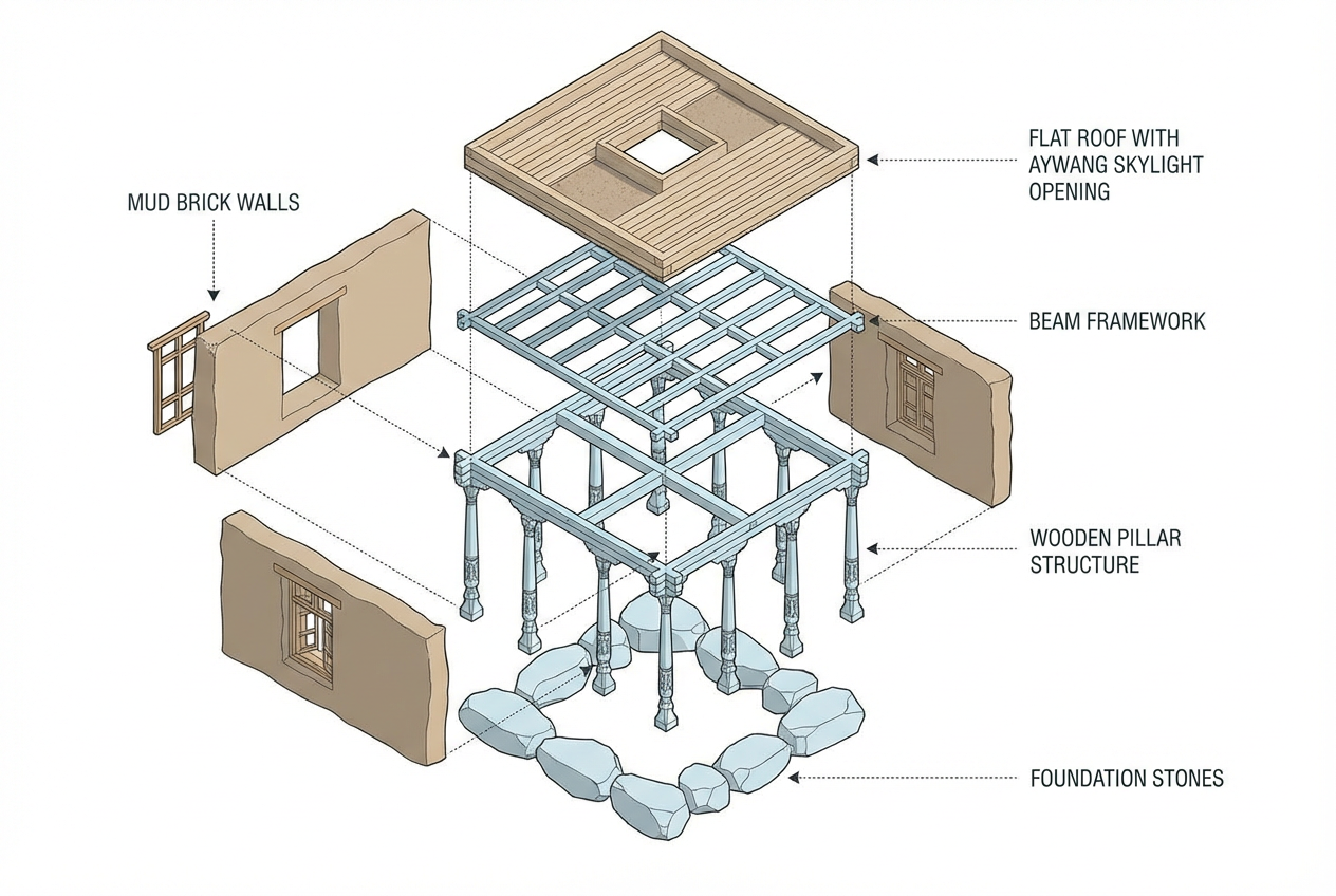 和田阿以旺民居建造从地基开始,采用石块和夯土打造坚实基础。地基通常高出地面30-50厘米,防止地下水侵蚀土坯墙体。